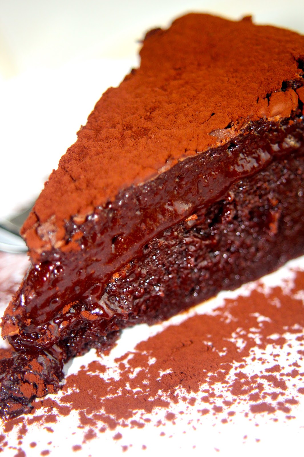 Die Oberfläche des Kuchens mit einer Palette glätten, die Kruste bricht dabei. Die restliche Schokocrème darauf verteilen und glatt streichen. Den Kuchen weitere 20-25 Minuten backen, bis bei der Garprobe am Holzstäbchen noch ein paar feuchte Krümel haften. Den Kuchen aus dem Ofen nehmen und in der Form vollständig auskühlen lassen und erst dann aus der Springform lösen. Den Kuchen mit Kakaopulver bestäuben und servieren. Yummi!!!
